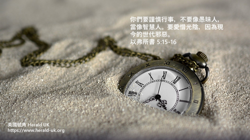 《聖經》金句說:「不要像愚昧人,當像智慧人。要愛惜光陰。」愚昧人只顧眼前享樂,糟蹋時間;智慧人卻會勤奮積極,善用分秒。要愛惜光陰,似乎是老生常談,然而,金句中的「要愛惜光陰」,其實有「要贖回時間」的意思。我們以前可能曾經虛度了寶貴的光陰,現在就要醒覺了。如果時間的無形記賬人,將「一事無成」這個結果給了我們,那就為時已晚了。所以,我們都要愛惜光陰,急起直追作出補救,贖回以前荒廢了的時間。