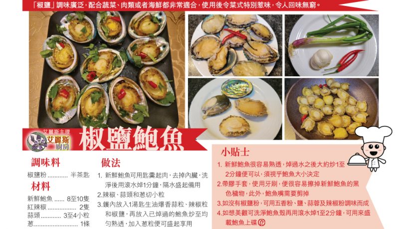 - 鑊內放入1湯匙生油爆香蒜粒、辣椒粒和椒鹽,再放入已焯過的鮑魚炒至均勻熟透,加入葱粒便可盛起享用
