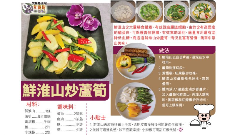 鮮淮山含大量膳食纖維,有效促進腸道蠕動。由於含有高黏度的醣蛋白,可保護胃部黏膜,有效幫助消化,適量食用還有助降低血糖。而這道鮮淮山炒蘆筍,清淡且富有營養,簡單中帶出美味。