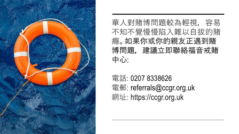 如果你或你的親友正遇到賭博問題,建議立即聯絡福音戒賭中心。(電話:0207 8338626;電郵:referrals@ccgr.org.uk)