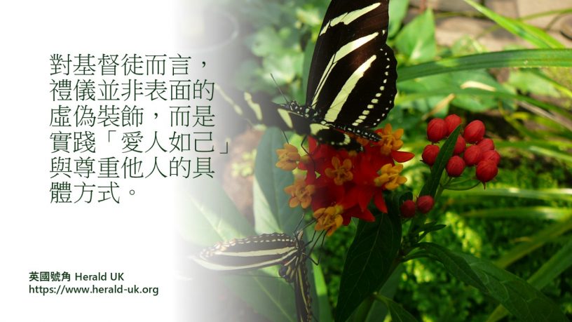 良好的禮儀與舉止,不僅是社交技巧,更是反映一個人內在品格與信仰的外在表現。對基督徒而言,禮儀並非虛偽的裝飾,而是實踐「愛人如己」、尊重他人的具體方式。聖經教導:「你們的言談要時常帶著溫和,好像用鹽調味,讓你們知道該怎樣應對每一個人。」(《歌羅西書》四章6節)由此可見,禮貌與良善的態度,是基督徒日常生活中應有的見證。