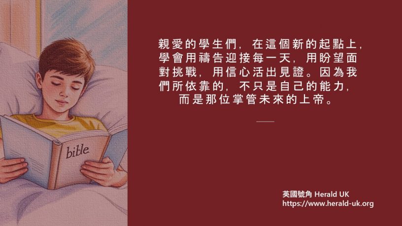 親愛的學生們,在這個新的起點上,學會用禱告迎接每一天,用盼望面對挑戰,用信心活出見證。因為我們所依靠的,不只是自己的能力,而是那位掌管未來的上帝。