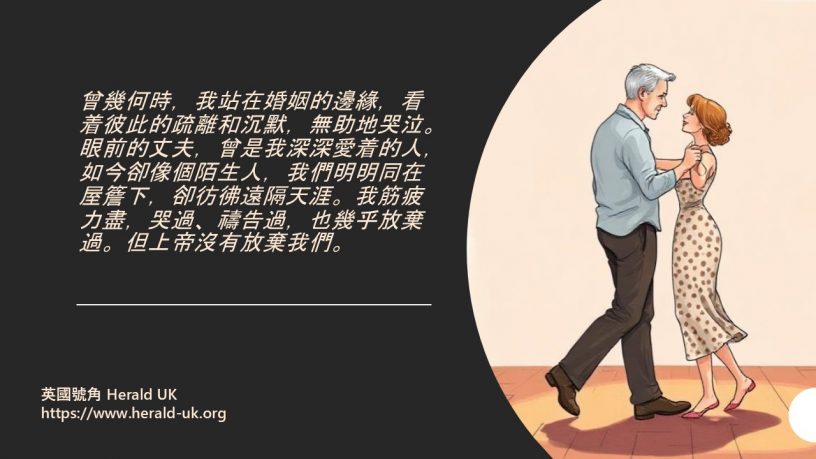 曾幾何時,我站在婚姻的邊緣,看着彼此的疏離和沉默,無助地哭泣。眼前的丈夫,曾是我深深愛着的人,如今卻像個陌生人,我們明明同在屋簷下,卻彷彿遠隔天涯。我筋疲力盡,哭過、禱告過,也幾乎放棄過。但上帝沒有放棄我們。
