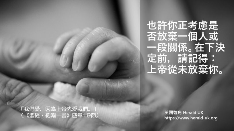 「我們愛,因為上帝先愛我們。」(《聖經•約翰一書》四章19節)也許你正考慮是否放棄一個人或一段關係。在下決定前,請記得:上帝從未放棄你。