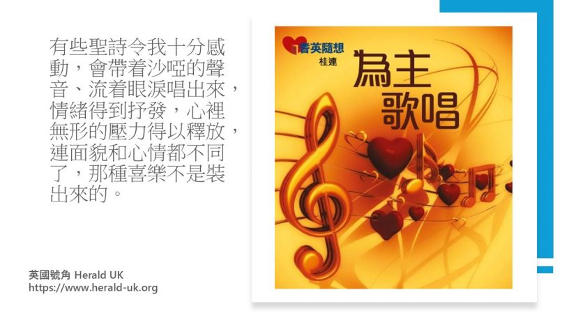 這情景令我懷念起以前去教會的日子。在主日唱聖詩,預備我們的心聽道。有些聖詩令我十分感動,會帶着沙啞的聲音、流着眼淚唱出來,情緒得到抒發,心裡無形的壓力得以釋放,連面貌和心情都不同了,那種喜樂不是裝出來的。在我們教會的周三團契,每次都有唱詩歌的時間,每個月還有一次專題是唱聖詩,甚至還有唱福音粵曲的時間,真的好得無比。
