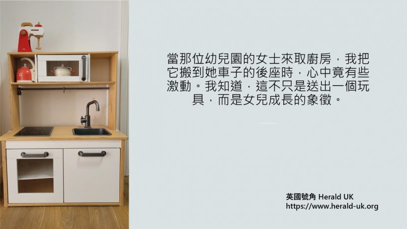 我向女兒解釋:「如果我們送出去,會有很多小朋友因為這個廚房而感到快樂。想像一下他們臉上的笑容吧。」她沉默了一會兒,然後點點頭。雖然心中仍有不捨,但她願意將這份快樂分享給更多孩子。