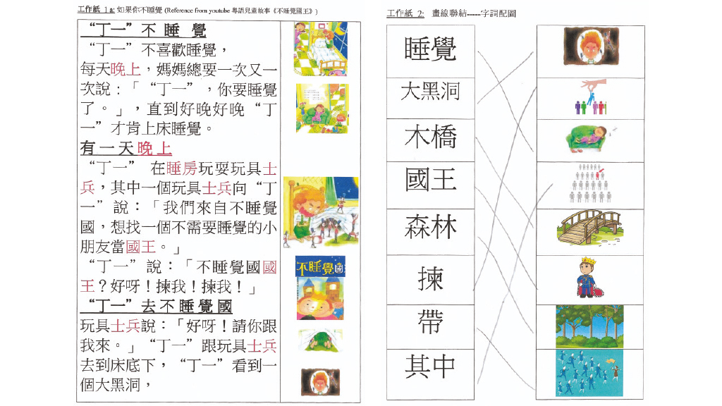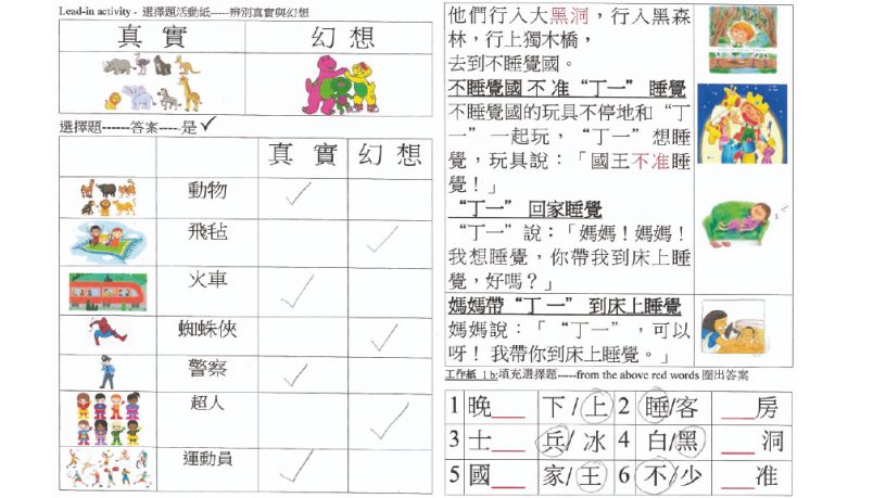 兒童故事多半交織着幻想與真實,例如當筆者教導七歲的軒軒故事《不睡覺國王》,首先分辨人與物是幻想或真實,筆者運用工作紙讓兒童認識人與物的中文名稱,並延展兒童思考故事的人與物是屬於幻想或真實,故事中的兒童「丁丁」 因為不肯遵從母親提醒,晚上沒有準時睡覺,結果誤入「不睡覺國」並成為國王,當他很疲倦,但是,士兵卻不許他睡覺,最後他逃離了「不睡覺國」,遵從母親的話準時睡覺。