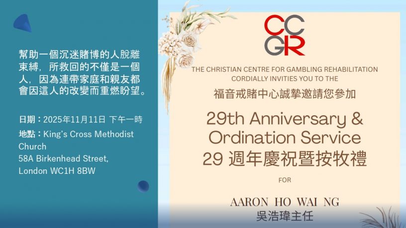 (關於二十九週年慶祝詳情,請瀏覽福音戒賭中心網站:www.ccgr.org.uk)
