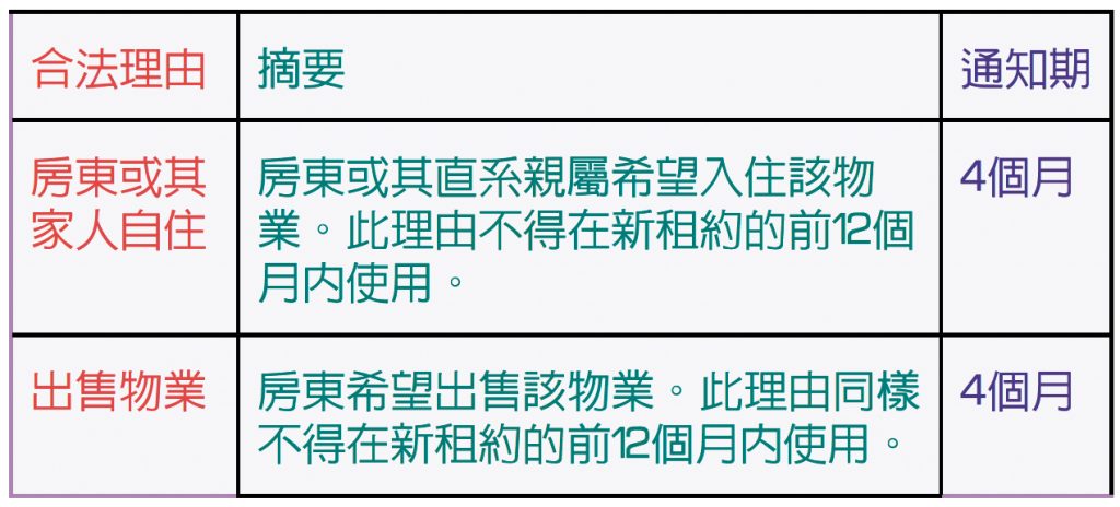 《租戶權益法案》明確列出房東可用來驅逐租戶的合法理由,以及必須給予的通知期限。請參考下表: