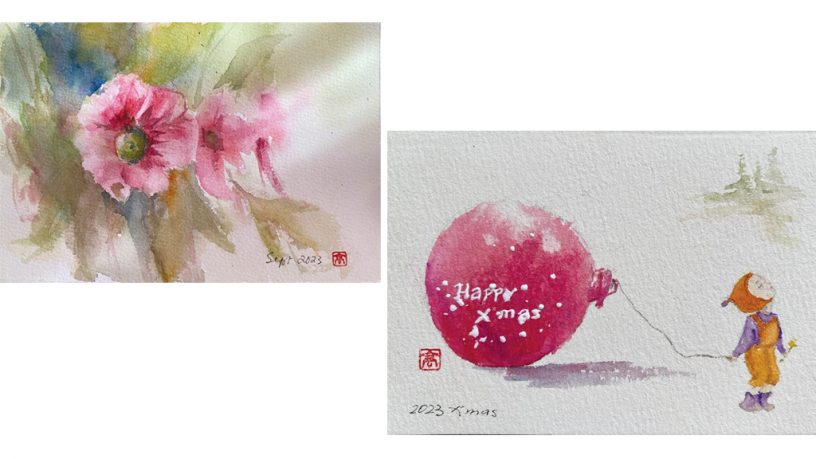 她的作品《早晨春花》,流露出一種安靜與自在,彷彿畫者的內心平和而喜樂;而聖誕卡《昂然前進》,則展現出自信與積極,讓人感受到世界的美麗與盼望。