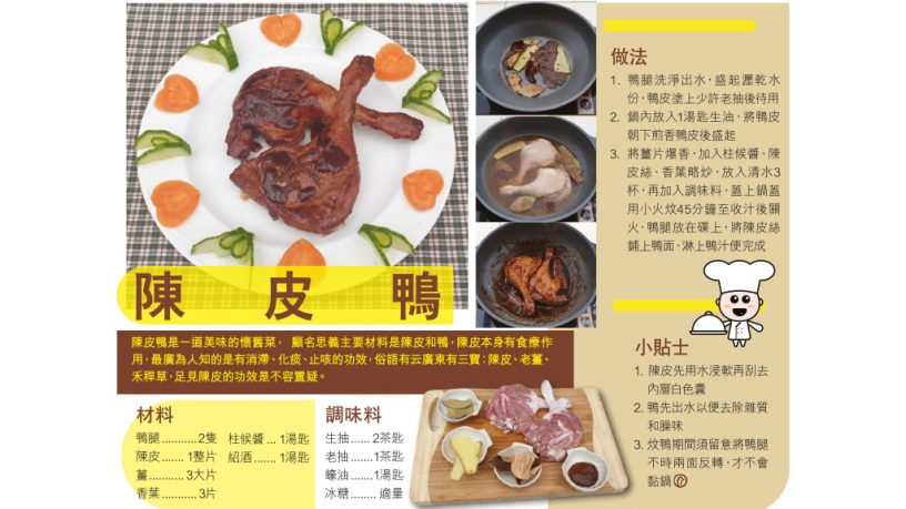 陳皮鴨是一道美味的懷舊菜, 顧名思義主要材料是陳皮和鴨,陳皮本身有食療作用,最廣為人知的是有消滯、化痰、止咳的功效,俗語有云廣東有三寶:陳皮、老薑、禾稈草,足見陳皮的功效是不容置疑。